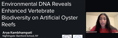 Arya Kambhampati, Manhattan high school senior mentored by PHE’s Mark Stoeckle, presented on 13 December remotely to the 8th Annual Meeting of The eDNA Society in Yamaguchi, Japan on using eDNA to measure vertebrate biodiversity on oyster reefs such as those now being encouraged in New York Harbor. Congratulations, Arya, on your first talk to a major scientific conference.
